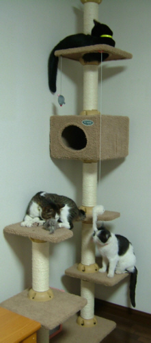 夜9:00過ぎたのでなんも食べられません。いやべつに美容にいいからとかじゃなく、明日人間ドックだから9時から絶食なの。でも一杯だけコーヒー飲みたい。まだ9時10分だからいいよね。。。。夫「こら、お前は何食ってんだ!」 私「1個だけだよー」 夫「胃に影が映ったらどーする。この丸いのはなんだって医者に言われたらどーすんだ!!」 私「マカダミアナッツです、って言うもん」 ‥‥菱沼さんと漆原教授じゃないんだから。でも明治のマカダミアナッツのホワイトチョコ、美味しいと思いません? かーなり気に入ってるんですが。 チョコと言えば昨年末から我が家では朝一番のココアに填っている。日経のメールニュースでこんな記事を見つけたのがきっかけ。朝一番の甘いものは血糖値の上からもいいし。ポリフェノールはともかくピロリ菌を退治してくれるのが凄い。もともと仕事忙しくなると胃にくるタイプなので、なんか良いかなと思って。10年ぐらい前は身体に良い食べ物とかあんまり真剣に考えてなかったけど、つい飲んでみようとか思ってしまうのは歳をとったからだなぁ。 最近ちょっと困っているのが、妙にイライラすること。私は先走るきらいはあるんだけど(苦笑)、感情的にはなりにくいタイプらしく、同僚や上司からよくそう言われてきた。それが最近、なんか苛つくことが多くなってきた。仕事ではまだ無いけど、例えばプライベートでやらなきゃいけなかったことを忘れてて、忘れてた自分に苛つくとかそういう感じ。 11月から休み無しで仕事のことやってるのも良くないんだろうが、それだけじゃない気がするなぁ。やっぱりちょっとずつホルモンバランスとか変わってきてるんだろうかとか、色々思っちゃう今日この頃。歳とるって、ほんとにとって見なきゃわからんもんだ(苦笑) 2005 Jan.16:キャットタワー