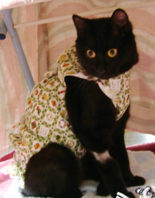 右は昨日撮影した手術翌日のマール。物干しにカーテンを掛けて作った臨時テントの中に居る所。拘束衣であちこちでしっかり縛られているのでハムのようですが、実際はそんなおデブではありません。拘束衣と言っても布をネコの体に合わせて切って巻いてあるだけ。術後専用の服もあるらしいのですが、かかりつけの獣医さんはムダなものは使わず、できるだけ畜主にお金をかけさせないように考えてくれる人なんですよね。治療の時も個体の生命力を重視してムダな投薬はしない。病院も小さくて豪華な設備とか無いんだけど、なんか獣医の赤髭先生のようで好きです。ちなみに女医さんですが。 しかしカントリー柄で背中で何カ所もリボン結びになっているので可愛いと言えば可愛いのですが、マールにすれば居心地悪いことこの上なし。お腹が舐められないだけじゃなくて、うまく丸まれない。横に寝ようとすると、こてんと倒れてしまうし。 木曜日に病院に連れて行った時は声も出ないほど緊張しまくって震えていて本当に可哀想でした。その夜8時に引き取りに行ったら、今度は唸り続けていて、しゃーっという威嚇声まで出すので余計哀れ。今までみぃみぃしか言ったことなかったのに。点滴の針がまだ刺さっていて、ゲージに入れる前に抜いたけど、腕が細いから相対的に針の穴がでかいのなんのって。ちなみに写真で右手の途中に白いとこがありますが、これが点滴のために剃られた部分です。 傷は痛いし拘束衣のせいでうまく動けないし、家に帰っても唸り続けてました。おしりのあたりを触ると威嚇声になるので抱き上げるのもストレスになりそう。ということで居間中を温めてマールが入り込みそうなところに毛布やら座布団やらを敷き詰め、トイレも居間に用意し(普段は洗面所にある)、万全の態勢で寝た‥‥ら、夜中、けっこうあっさり夫の布団に来て寝てた。ただヘタに動かすと唸り出すため、夫はほとんど硬直して寝てたらしいですが(汗)。 しかし流石はネコ。手術の夜にもう1人でトイレに行けたし、昨日は少しずつ食べ始めて、少々高い棚にも上れるようになりました。うっかり触ると怒るが、見えるところに人がいないとイヤという微妙な状況で、私は昨日ずっとマールと一緒に居間にこもりきり。マールは私のことを眺めつつ、臨時テントの中、座卓の下、セレクターの上の3カ所を転々としていたのでした。 そして今日はやっと普通に。歩くときは服のせいでよったよったしてますが、抱き上げるとごろごろ喜ぶ普通のマールちゃんに戻りました。体重計ったら術前に3.5Kgあったのが3.2Kg。食べなかったからね。 とはいえこる兄ちゃんは、服を着せられて歩き方もいつもと違うマールが不気味な生き物に見えるらしく、近づくと唸る(汗)。もう、いい加減にしなさい。女の子は大変なんだから! その点ぐりはよい子で、マールがぐりの皿に顔をつっこんで食べていても仕方なさそうに見ているし、近づいてくると舐めてあげたりしているのでした。 2005 Feb.27:リハビリのつもり