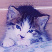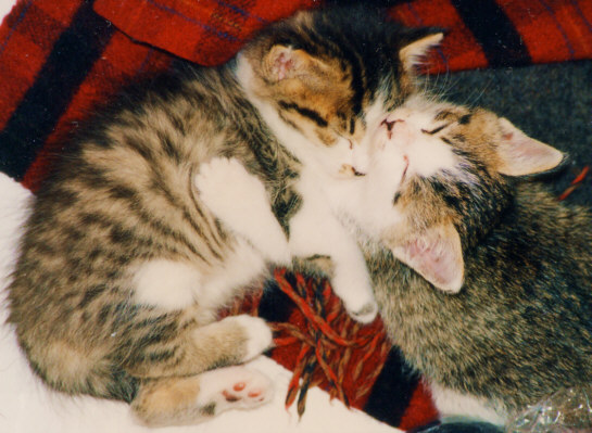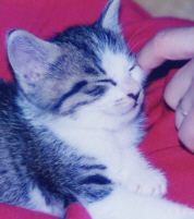 上の写真は左がぴので右がぐり。右の2枚は左がぐりで右がぴのです。ぴのは両方の頬にキジ模様が入ってますが、ぐりは左のほっぺが白いです。毛の感じも、ぴのはふかふか系、ぐりはつんつん系ですか。拾った時はぴのが390g、ぐりが360gだったのですが、ぴのは頭のでかさと毛のボリュームで、ぐりより一回り大きく見えたんですよね。3枚とも拾って3日目ぐらいの写真です。ちなみにこるくは拾った時に420g。マールの180gってのはチビ助ぐりの半分でした。 ぐりは写真では目を閉じてるのであまりわかりませんがとにかく"がきんちょ"って感じでしたねぇ。ひたすらお兄ちゃんのおっぱいを吸って(もちろんミルクはでない)、鼻がちょっとすりむけ気味になってたりして(笑)。ぴのは妙に大人びた感情豊かな子でとにかく賢かったんですよね。自分の前足で支えきれない頭のでかさは伊達じゃなかったというか。 この2人を拾った時はまだ借り家住まい。あと半月で今の家が完成するという頃でした。ペット不可だったのに大家さんに頼んで半月だけ飼わせてもらったのです。ドラッグストアで大きな段ボールを2つ貰ってきて仔猫が通れるような穴を開けてつないで、即席のにゃんこハウスを作って飼ってました。 ぴのとぐりの写真は、"最初の子の写真はやたらある"法則に則り沢山あります。やっぱり何度見返しても天使のように可愛いです。とはいえぴのが亡くなって2年近くはこのアルバム開けなかったのですが。 2005 Mar.29:30万ヒット!