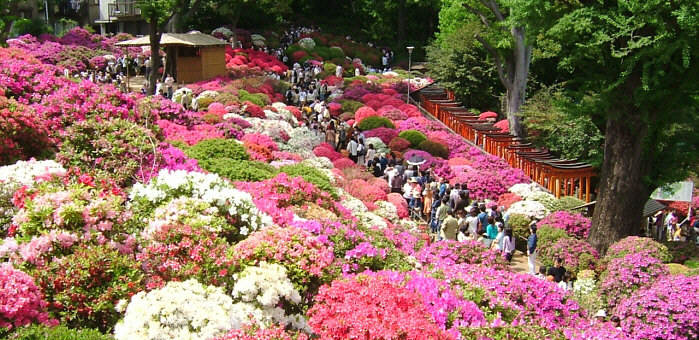強風も止んだのでお出かけ。朝はすごーく久しぶりにモスバーガーに寄った。レタスがいっぱいのバーガーかと思って菜摘ってのを頼んだらパンが無くてビックリした。自分は野菜+お肉という組み合わせがとっても好きなんで嬉しい誤算でした。それ以前に、メニューを良く見るように(苦笑)。そしてもう一つ爆笑事件。財布をバッグに入れようとしたら中にマールの玩具が入ってる〜〜〜! 出がけにマールがバッグの中を覗き込んでいたのだが、まさかくわえてきた玩具を入れてた所とは気付かなかったわい。とういことで今日は1日マールの玩具を持ってあるくハメになった。さて目的地は根津神社。都バスでパンフを見かけて行こうと思ってたら、どこかでポスターを見かけたダンナも同じ事を考えていたという。ツツジ園が有名でこんな感じになってました。 ![]()