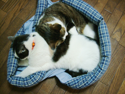 ブラッシングについても猫によっていろいろだ。我が家でブラッシングが一番好きなのはぐり。ブラシを見せると「にゃっにゃ〜ん」(本当にこう鳴く)と言って駆け寄ってくる。思いっきりがしがしブラッシングして大丈夫。こるくは2歳ぐらいまではブラッシングが嫌いだったが、今は好き・・・なんだけど、この子の毛は抜け毛がブラシにからみつかずにばらばら落ちるだけなので、とってもやっかいだ。もしかして麻混なのか? あとこるくは水猫(体がふにゃふにゃで主体性が無い猫を我が家ではこう呼ぶ)なので、あまり強くブラッシングすると怒る。 今1歳のマールは昔のこるくと同じで、今はあまりブラッシングが好きじゃないらしい。マールはこるく以上の水猫だし(汗)。ただ櫛は大好きみたい。 そんなマールだけど、なぜかぐりをブラッシングしているとやってきて、ぐりと私の間のジャマになるところにでーんと寝る。 新聞を広げて読んでると、その上に長々と寝そべるのはどの猫でもそうなんだけどねー。どうしてこうかな。 2005 Jul.26:レンタル掲示板の広告にも