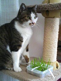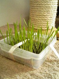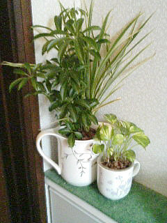![]() 我が家では猫草をスプラウト栽培用の容器で育ててます。この容器があればあとはティッシュペーパーと水とタネがあればOK。猫も若い葉の方が好きみたいなんですよ。でも頻繁にタネを蒔くと古根の絡まった土がたくさん出るので大変で。それで脱土&安上がり!を考えてスプラウトの容器に移行しました。 スプラウト容器は要は小さな水切りカゴみたいなもんです。カゴの上に折りたたんだティッシュを敷いて水で濡らしてタネを蒔く。猫は草をくわえて引っ張りますから、このままだとタネまで食べちゃいます。それを防ぐために鉢底用のネットをぴっちりのサイズに切って載せてワゴムで留めるワザを思いつきました。 ![]() 芽が出てくるまでは暗い所、芽が出たら明るい所(我が家では猫の魔手が届かないように上から吊してます)。食べられるサイズになったらキャットタワーに固定。けっこう好評です。 さて、今日は実家の手伝いをする予定で休暇を取っていたのですが、無しになったのでだらけてます。身体の調子も精神の調子もイマイチなので、ちょっと助かったかな。明日は法事があるので遠出しないといけないし。 でも何か1個はやりたかったので、トイレと風呂場のライム・ポトスを植え替えました。風呂場のは元気なのにトイレのが枯れ始めてきたので。ライムポトスは普通のポトスよりは寒さに弱いし、暖房が無いからきつかったかなぁ。でも3年間元気だったのに。 ちなみにこれ、元は伸びすぎた会社のポトスです。ちょんちょん切って持ってきた。容器も廃物利用でオトク気分でした。注ぎ口を欠いちゃった紅茶ポットにハイドロボールを入れて植えたり(笑)。中に網の入ってるポットって元からハイドロ用みたいでしょ。ポットをちょっとだけ欠いちゃったりしたらぜひどうぞ(笑) ポトス以外に何か植えたかったので買ってみました。ドラセナ・コンシンナ・ホワイボリーとカポックとガジュマル。ドラセナとかカポックとかでっかい鉢植えで見る奴ですが、それの小さいのがあったんですよ、1個300円で(笑)。「同じ形のくせに妙に小さい奴」ってツボなんですよね。小生意気で可愛い(笑)。 カポックは近所で路地植えを見るので寒さに強いだろうと思ってトイレ用です。ドラセナとガジュマルは調べもしないで選びました。どうもポトスと似たような耐寒性らしい。ドラセナは半分トイレに植えちゃったな。元気がなくなったら考えよう。 残り半分のドラセナとガジュマルと、生き残りのポトス全部は風呂場用にしました。ガジュマルと聞くとドリカムの「Eyes to me」を思い出すのですが、妹は「歌はいいけどホンモノ見るとちょっと怖くない?」と言ってたなぁ。私の買ったチビガジュマルも……抜いたら悲鳴を上げるんじゃないかと心配するようなカッコしてました。いや、マンドラゴラじゃないから(笑) なんで今日猫草の話題にしたかというと、マールがドラセナの葉をさんざん食いちぎってくれたからです。ちぎってはぺっと吐き出す。ちょっと目を離したスキにずいぶん喰われました。マズイなら喰うなよ?! そういえば最初の頃ポトスもずいぶん喰われたんですよね。味見してるのかな。ひどいぞ、マールちゃん。 2006 Mar.12:グリーン・グリーン